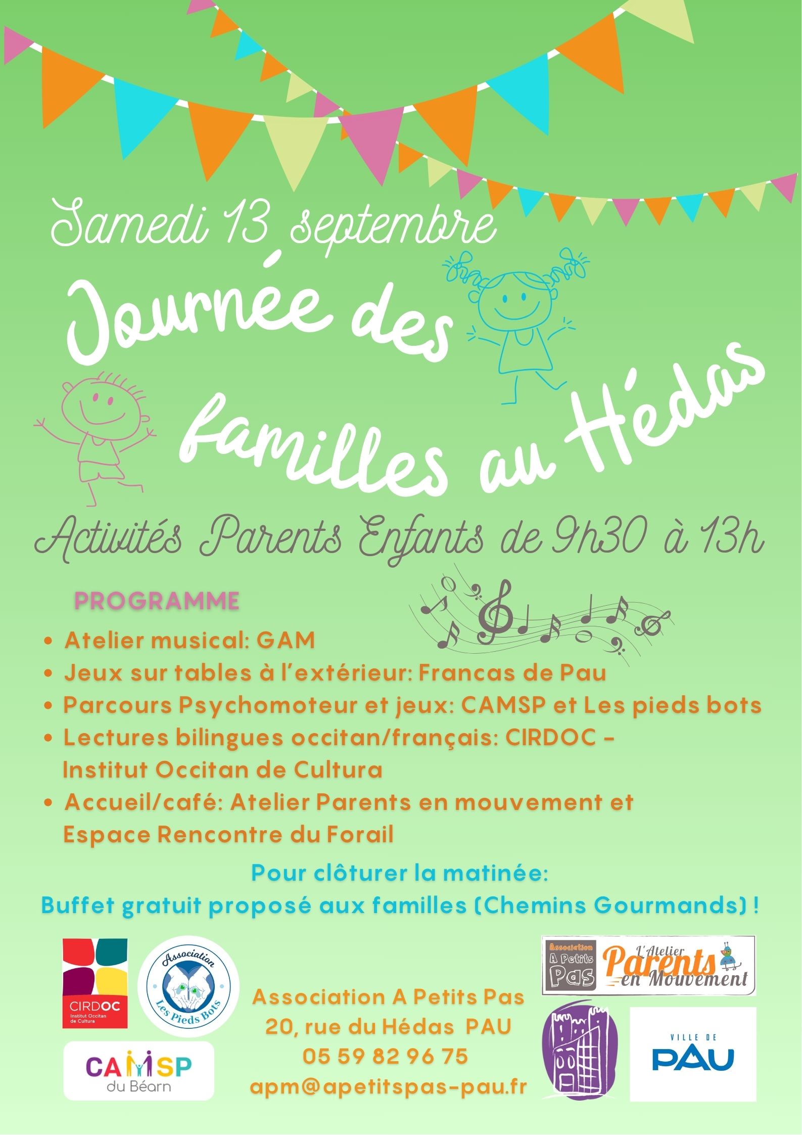 L'Associacion A Petits Pas e los autes aliats de aquesta jornada que perpausan animacions e jòcs dens lo quartièr deu Hédas tota la matiada e un repaish que serà auhèrt a las familhas a 13h .